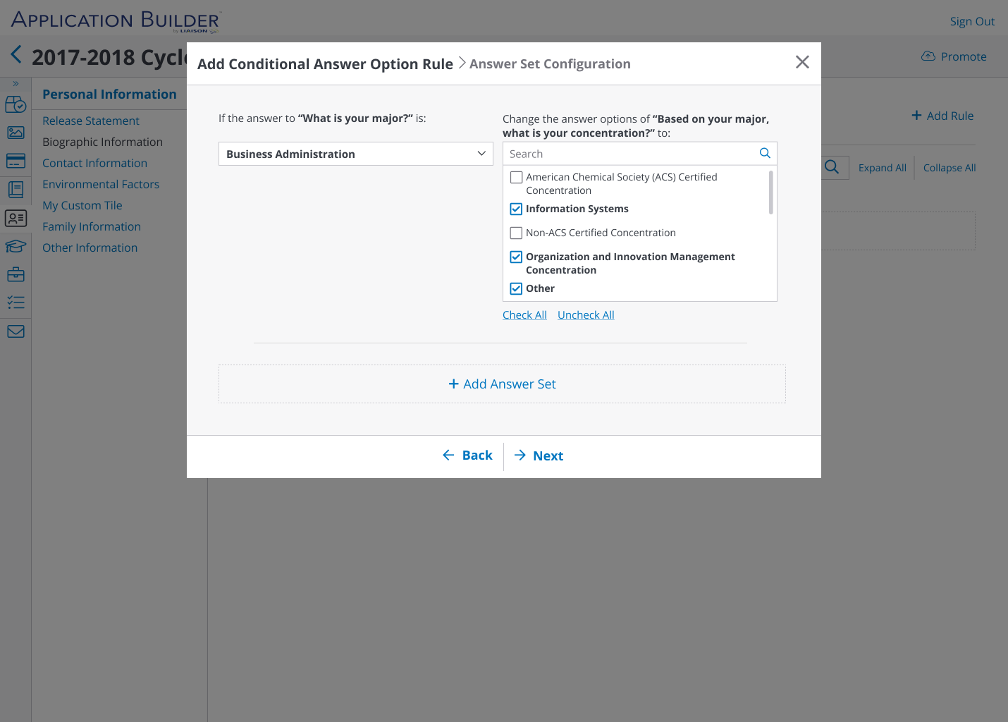 - Select which answers to a specific question would trigger conditional display logic for questions/answers further down in the application